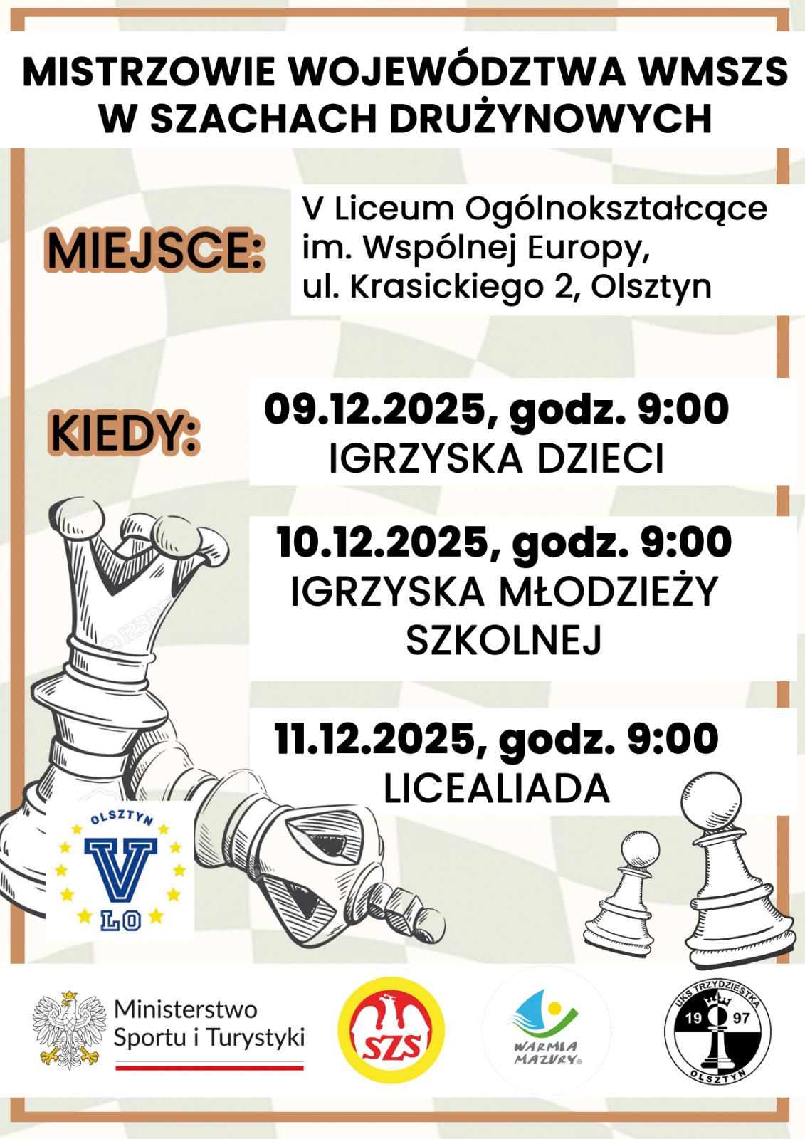 Z przyjemnością informujemy, że Gala Sportu Szkolnego WM SZS za rok szkolny 2024/2025 odbędzie się w dniu 03 12 2025, o godzinie 11.00, w sali nr 52 (parter) Urzędu Wojewódzkiego w Olsztynie.